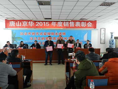 新年伊始,万象更新!猴年正月十八,唐山京华召开了2015年度销售表彰大会,会议由销售部吴红涛部长主持,公司各部门领导、各区域驻外业务经理及销售内部服务人员参加。会议在欢乐的氛围中进行!从市场开发、服务质量以及新产品销售等方面共评选出11名先进标兵,并颁发荣誉证书。鼓励大家2016年再接再厉,再创辉煌!供销副总胡武、销售部长吴红涛对2015年公司整体销售情况进行了总结分析,并对2016年的销售任务做出了安排。