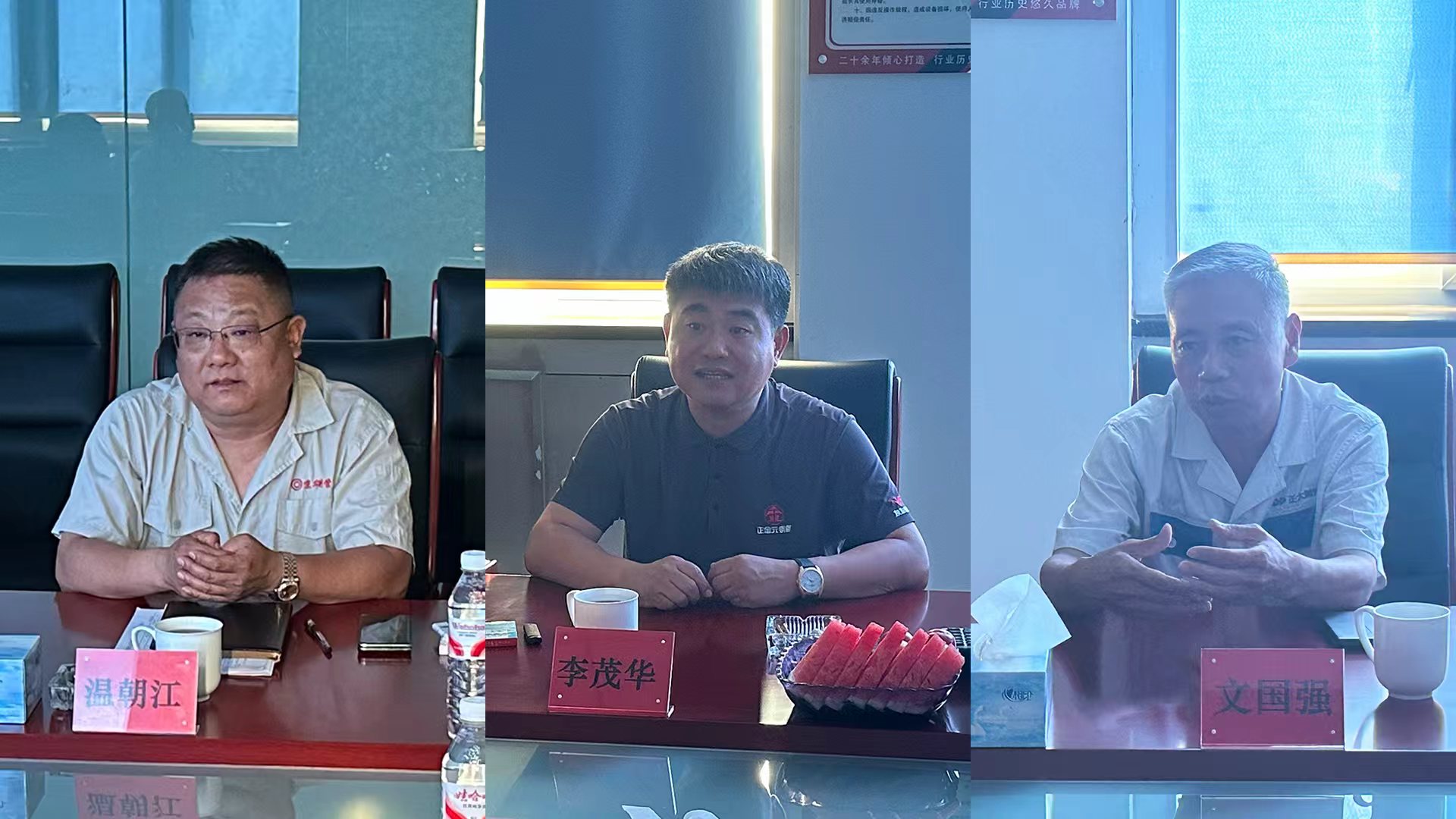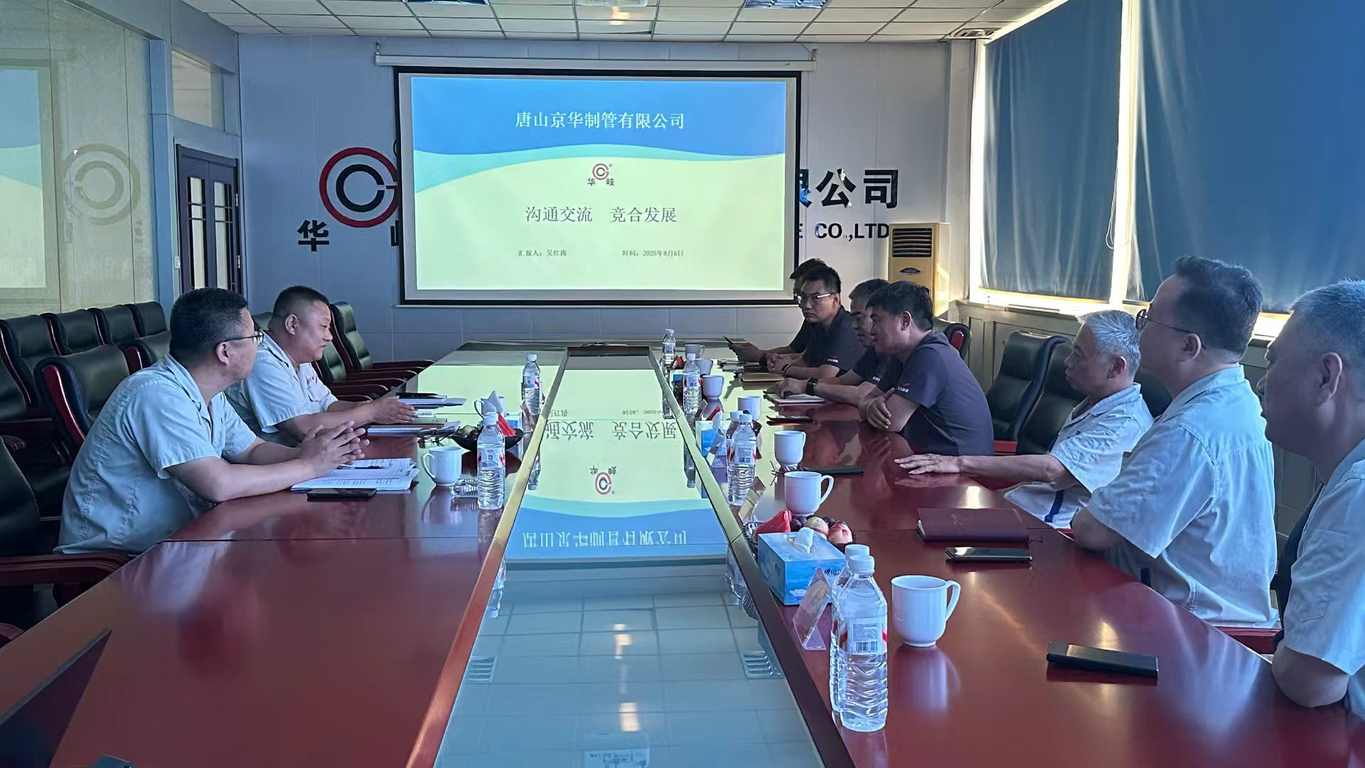 2025年8月6日唐山正元管业有限公司总经理李茂华、迁安正大通用钢管有限公司总经理文国强分别携销售主管人员应邀莅临唐山京华。公司总经理温朝江、供销副总胡武和销售主管人员接待并陪同,三方就当前焊接钢管行业面临的市场态势、客户需求及发展困境展开深入探讨,并达成共识。